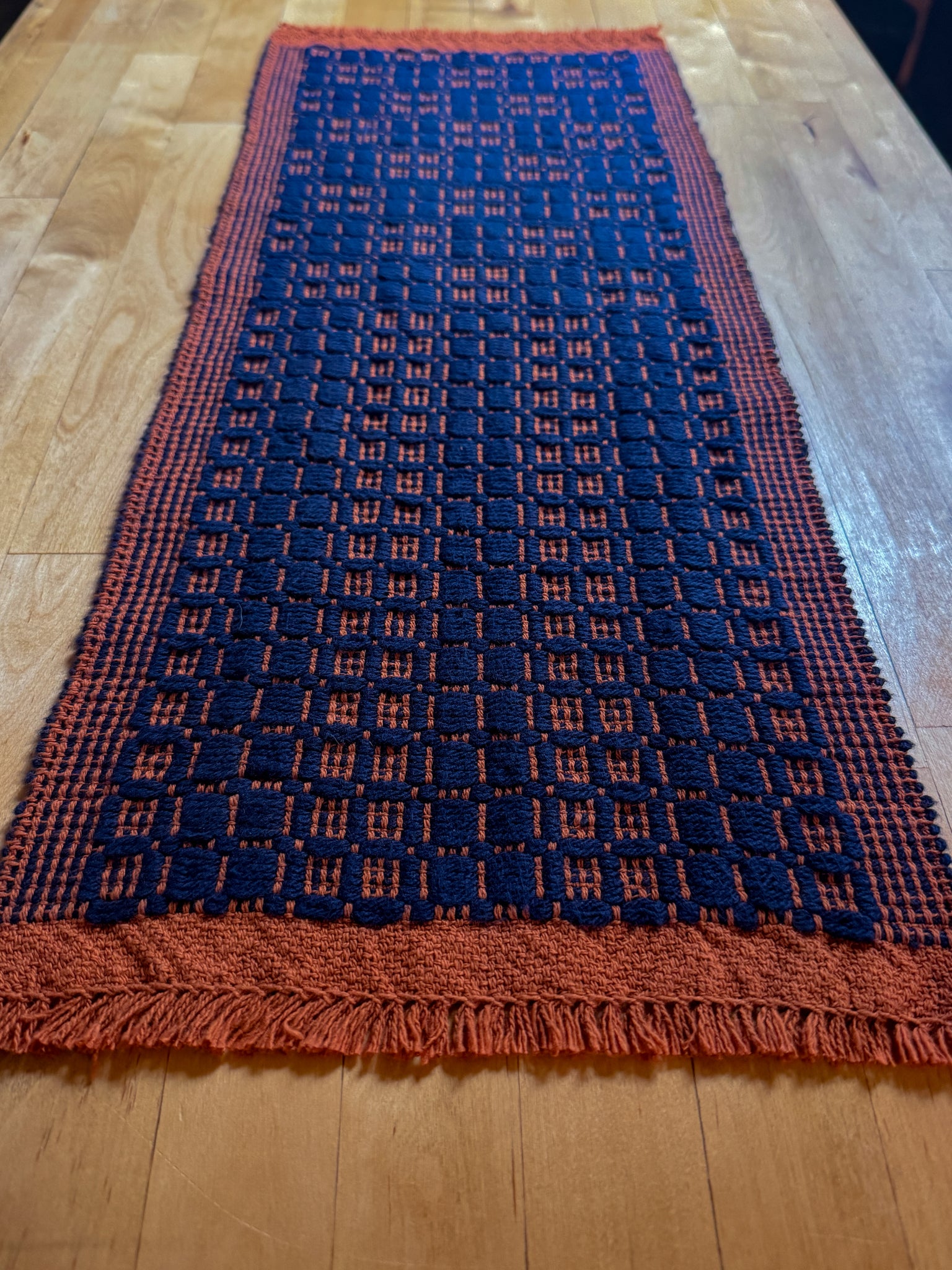 Lined bag measures about 9” x 10” with 10” handles. The woven fabric itself measures approximately 9½” x 23”—perfect for a decorative table accent!