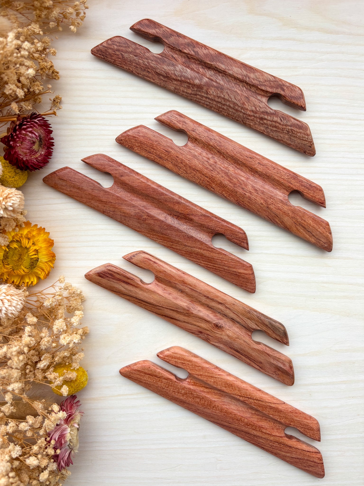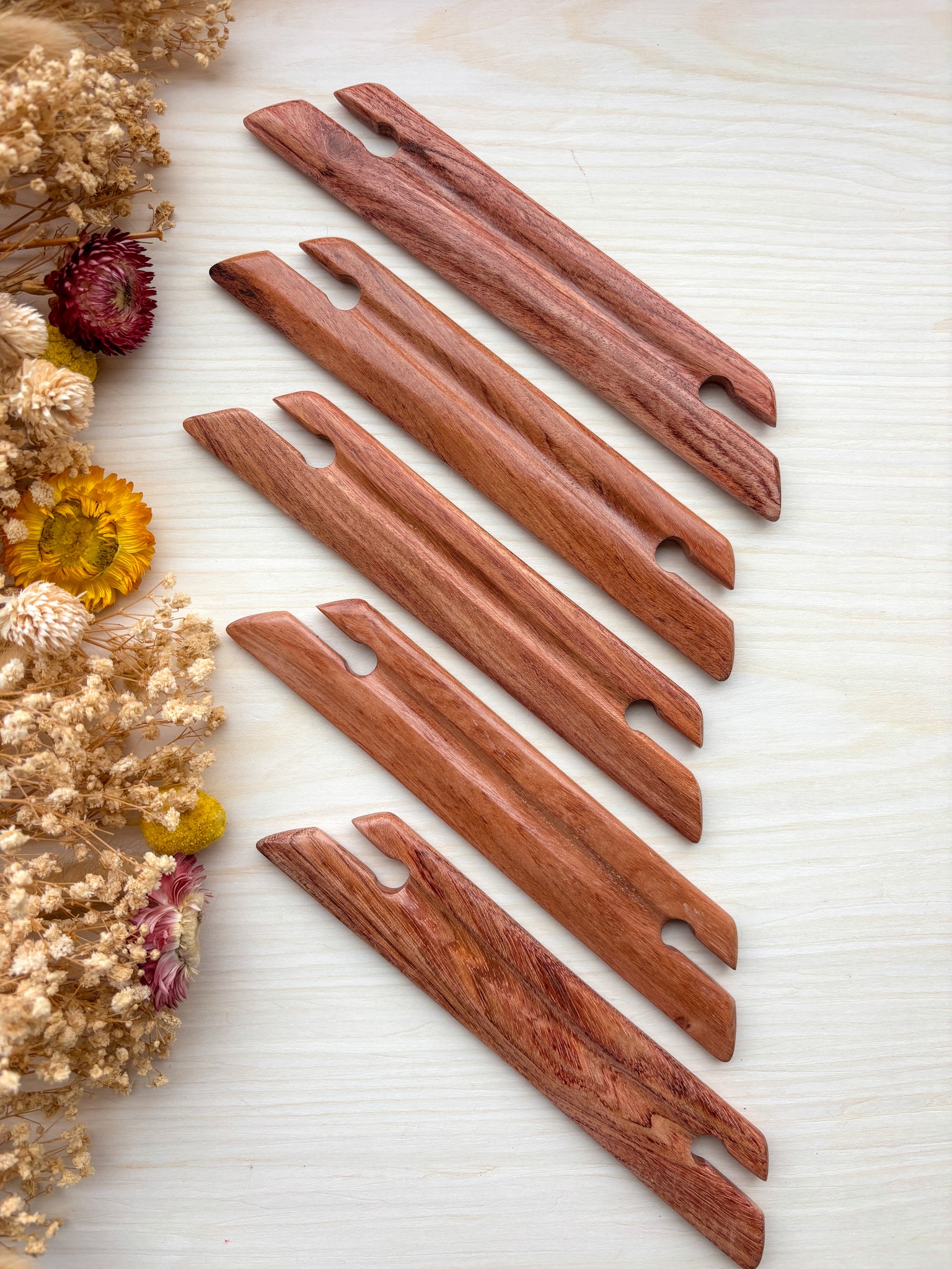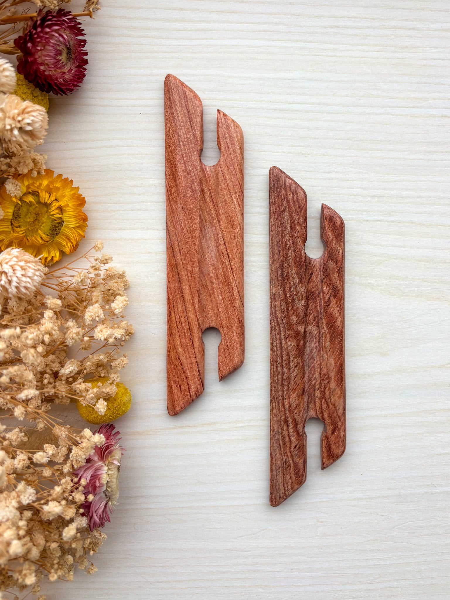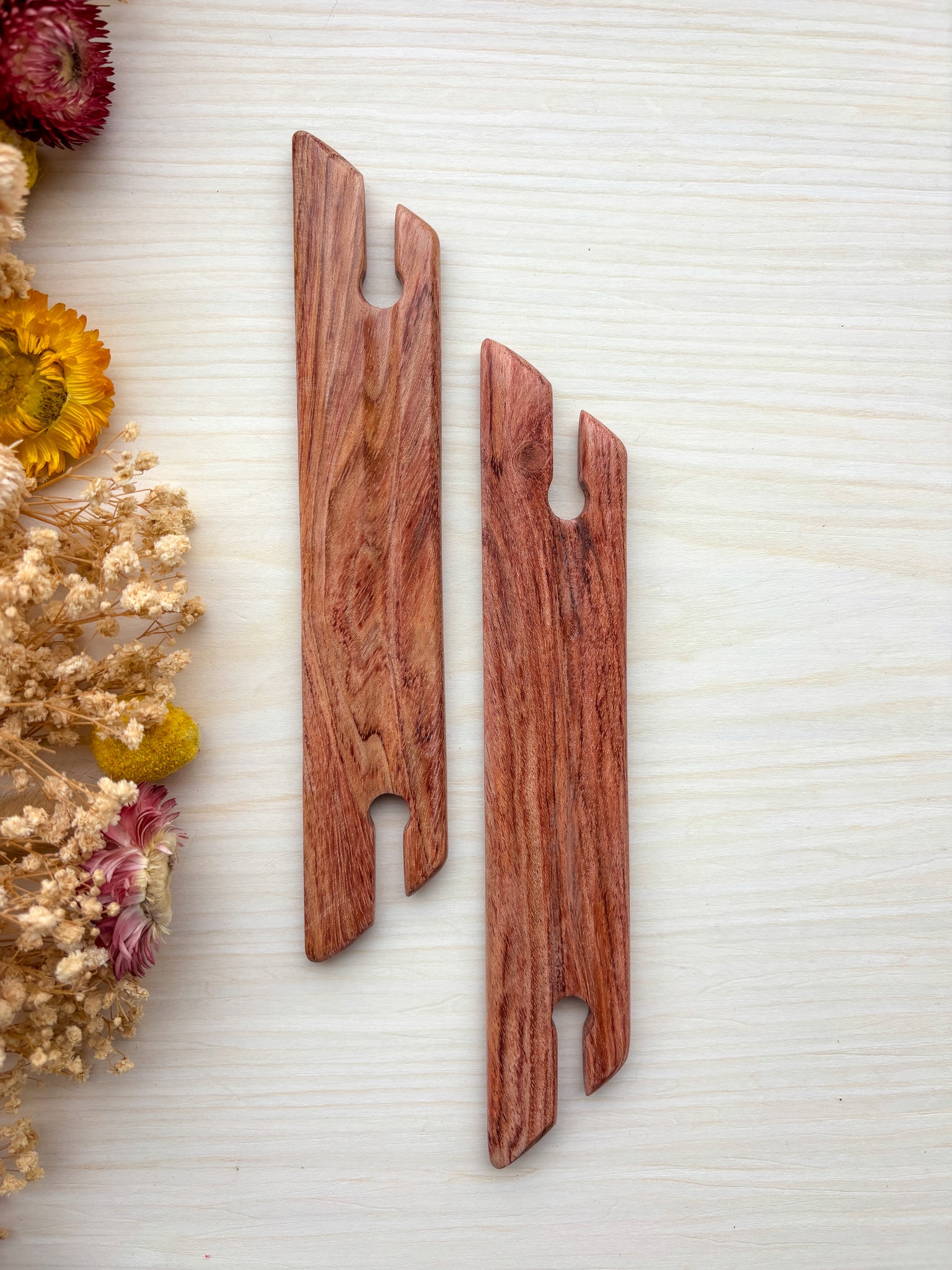 Each shuttle is crafted from durable hardwood for long-lasting use. Carefully sanded and stained, they offer a smooth, comfortable feel in your hand for enjoyable weaving sessions.