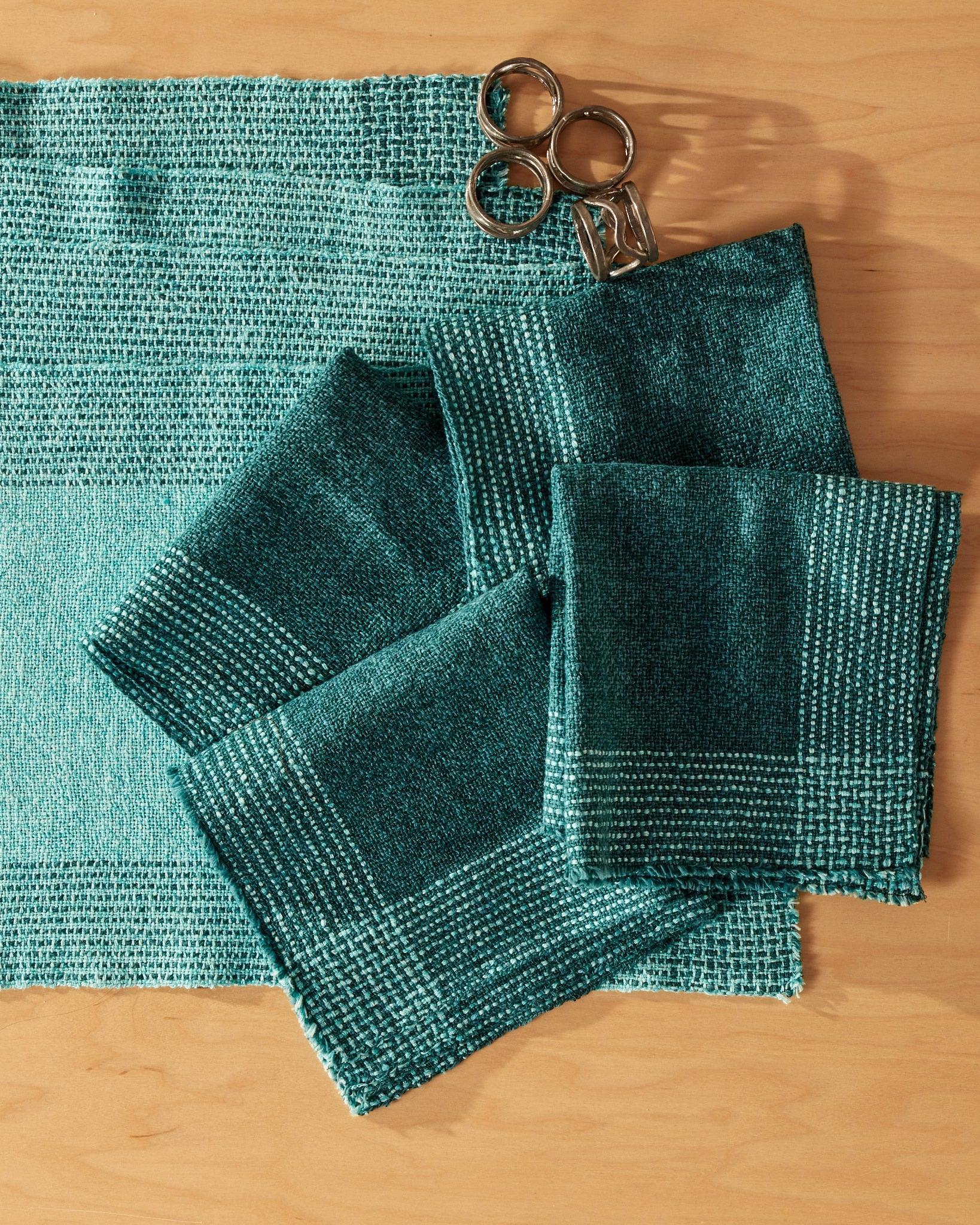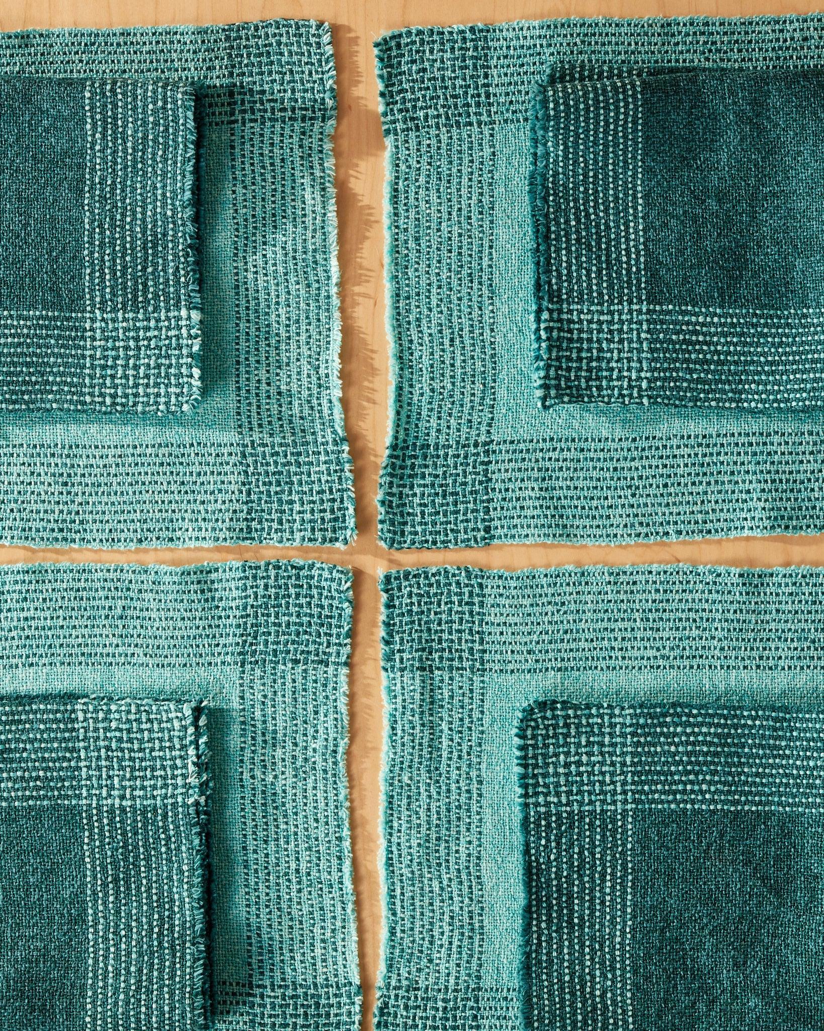 This kit includes a set of placemats and coordinating napkins, each woven on separate warps with opposite color arrangements to maximize yarn use and create a cohesive, stunning table set.